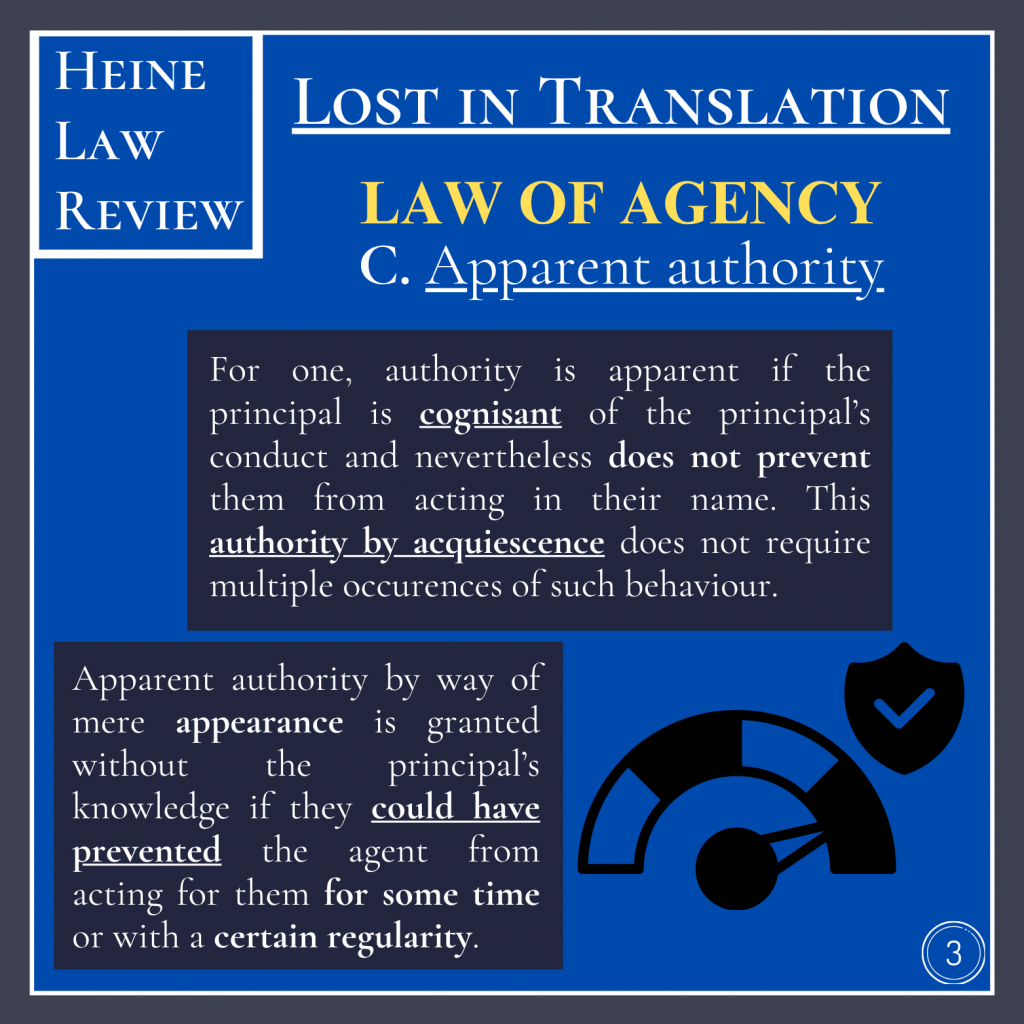 For one, authority is apparent if the principal is cognisant of the principal’s conduct and nevertheless does not prevent them from acting in their name. This authority by acquiescence does not require multiple occurences of such behaviour.