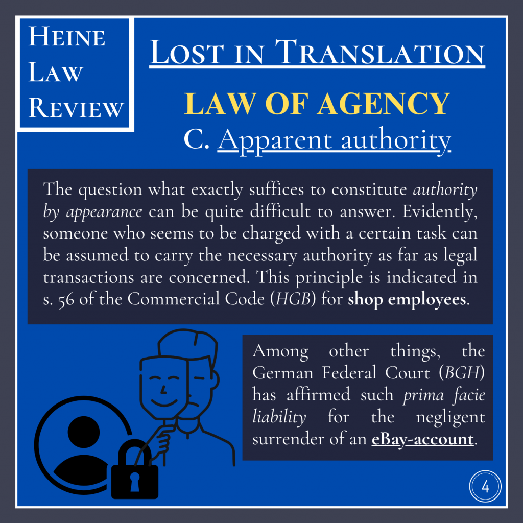 Apparent authority by way of mere appearance is granted without the principal’s knowledge if they could have prevented the agent from acting for them for some time or with a certain regularity. The question what exactly suffices to constitute authority by appearance can be quite difficult to answer. Evidently, someone who seems to be charged with a certain task can be assumed to carry the necessary authority as far as legal transactions are concerned. This principle is indicated in s. 56 of the Commercial Code (HGB) for shop employees. Among other things, the German Federal Court (BGH) has also affirmed such prima facie liability for the negligent surrender of an eBay-account.