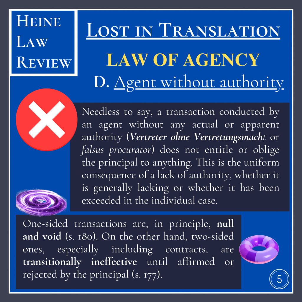 Needless to say, a transaction conducted by an agent without any actual or apparent authority (Vertreter ohne Vertretungsmacht or falsus procurator) does not entitle or oblige the principal to anything. This is the uniform consequence of a lack of authority, whether it is generally lacking or whether it has been exceeded in the individual case.