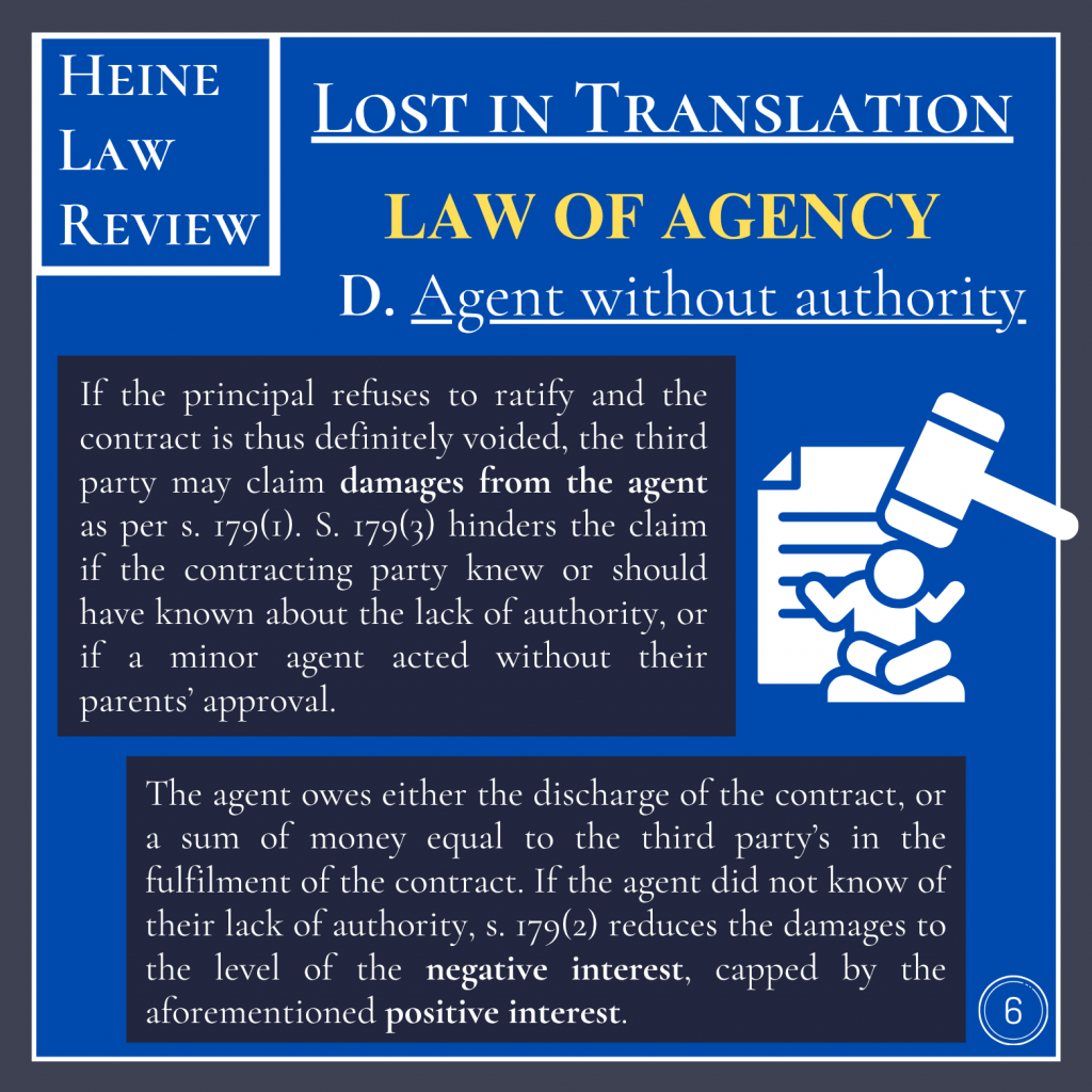 If the principal refuses to ratify and the contract is thus definitely voided, the third party may claim damages from the agent as per s. 179(1). S. 179(3) hinders the claim if the contracting party knew or should have known about the lack of authority, or if a minor agent acted without their parents’ approval. The agent owes either the discharge of the contract, or a sum of money equal to the third party’s in the fulfilment of the contract. If the agent did not know of their lack of authority, s. 179(2) reduces the damages to the level of the negative interest, capped by the aforementioned positive interest.