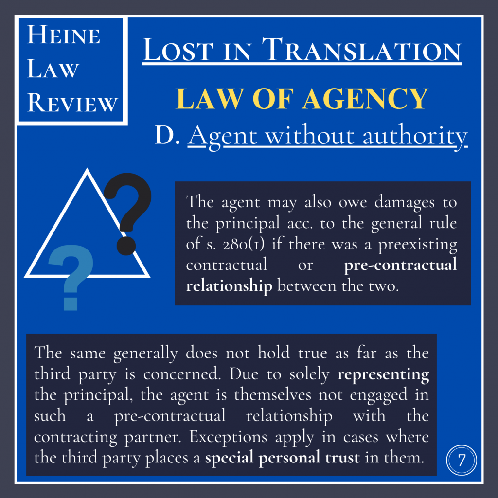 The same generally does not hold true as far as the third party is concerned. Due to solely representing the principal, the agent is themselves not engaged in such a pre-contractual relationship with the contracting partner. Exceptions apply in cases where the third party places a special personal trust in them.