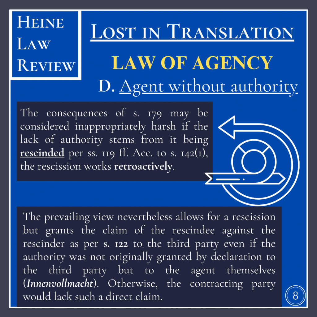 The consequences of s. 179 may be considered inappropriately harsh if the lack of authority stems from it being rescinded per ss. 119 ff. Acc. to s. 142(1), the rescission works retroactively. The prevailing view nevertheless allows for a rescission but grants the claim of the rescindee against the rescinder as per s. 122 to the third party even if the authority was not originally granted by declaration to the third party but to the agent themselves (Innenvollmacht). Otherwise, the contracting party would lack such a direct claim.