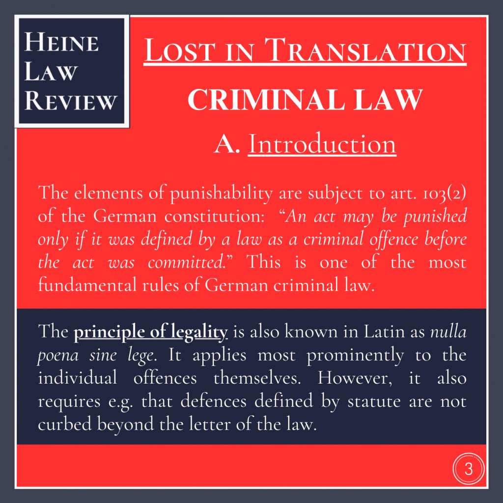 The elements of punishability are subject to art. 103(2) of the German constitution: “An act may be punished only if it was defined by a law as a criminal offence before the act was committed.” This is one of the most fundamental rules of German criminal law.