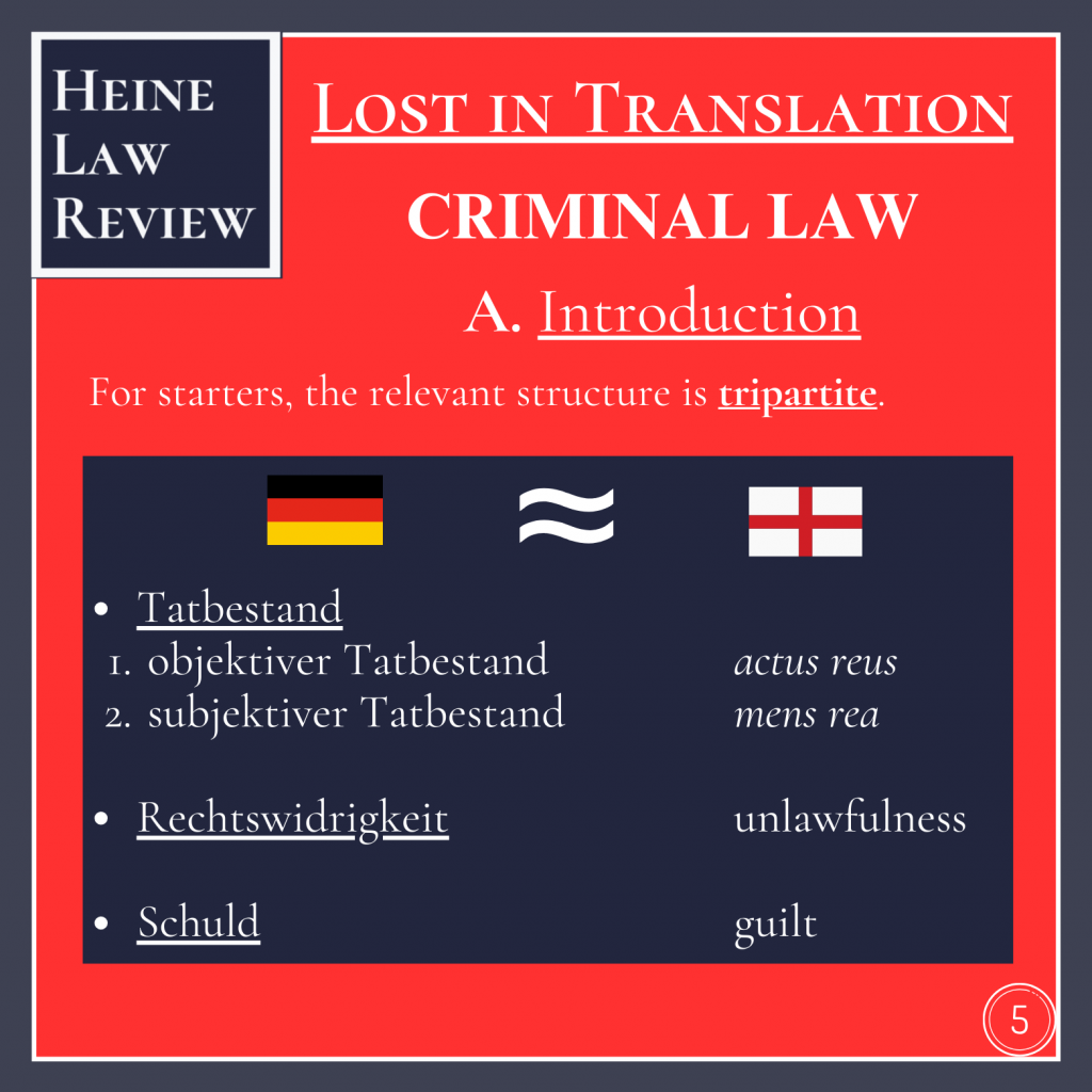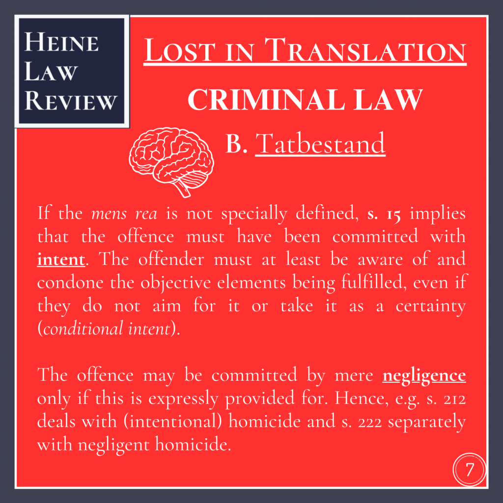 The Tatbestand is the positive description of the individual offence. This may include both the objective actus reus and the subjective mens rea.