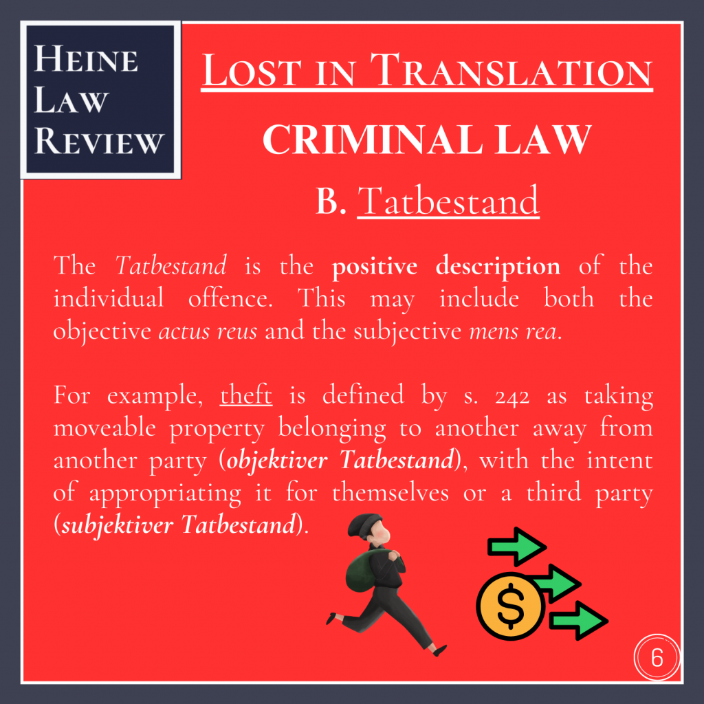 For example, theft is defined by s. 242 as taking moveable property belonging to another away from another party (objektiver Tatbestand), with the intent of appropriating it for themselves or a third party (subjektiver Tatbestand).