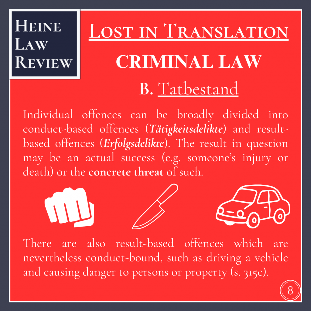 Individual offences can be broadly divided into conduct-based offences (Tätigkeitsdelikte) and result-based offences (Erfolgsdelikte). The result in question may be an actual success (e.g. someone’s injury or death) or the concrete threat of such. There are also result-based offences which are nevertheless conduct-bound, such as driving a vehicle and causing danger to persons or property (s. 315c).