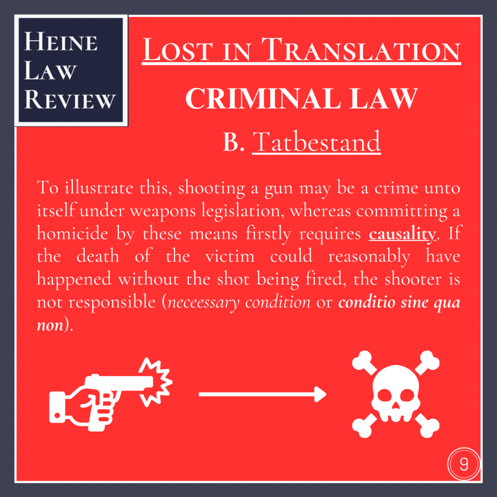 To illustrate this, shooting a gun may be a crime unto itself under weapons legislation, whereas committing a homicide by these means firstly requires causality. If the death of the victim could reasonably have happened without the shot being fired, the shooter is not responsible (necessary condition or conditio sine qua non).