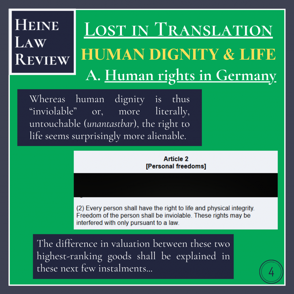 Whereas human dignity is thus “inviolable” or, more literally, untouchable (unantastbar), the right to life seems surprisingly more alienable.