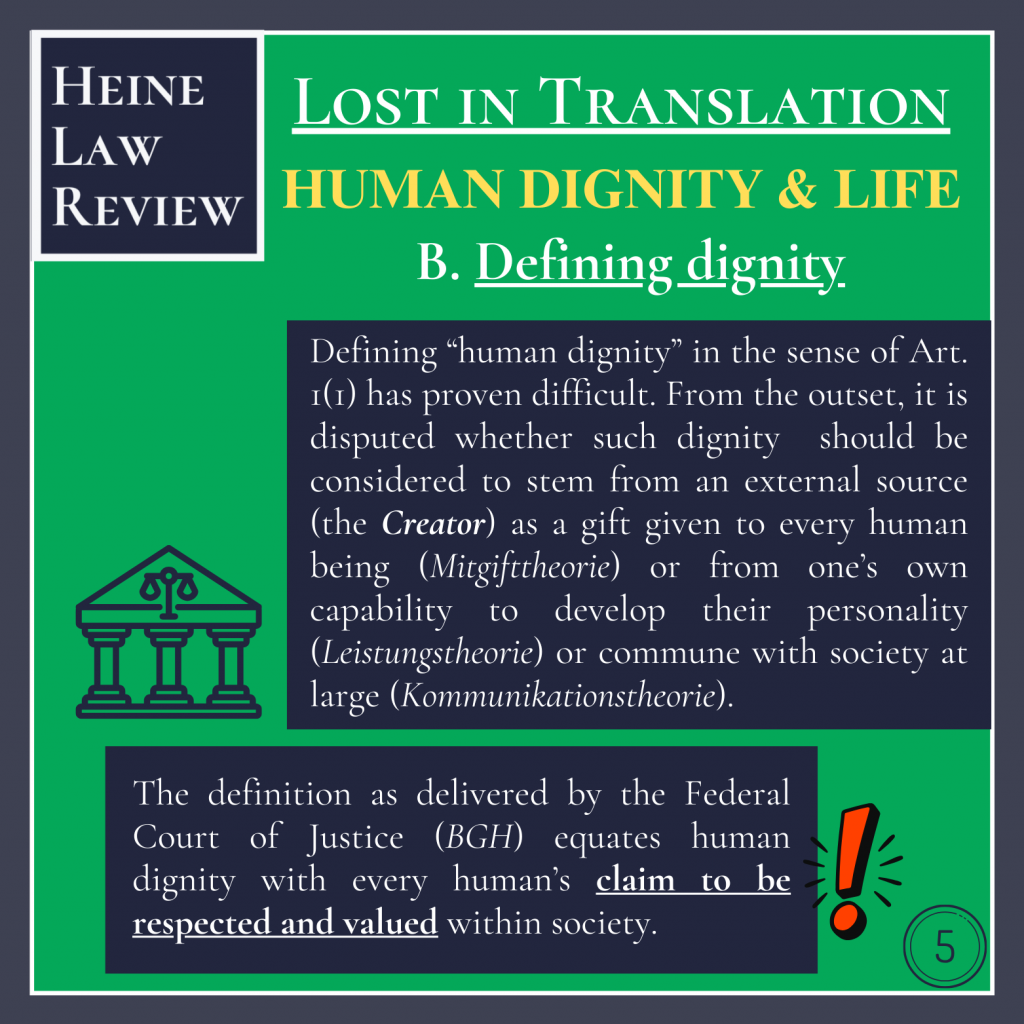 Defining “human dignity” in the sense of Art. 1(1) has proven difficult. From the outset, it is disputed whether such dignity should be considered to stem from an external source (the Creator) as a gift given to every human being (Mitgifttheorie) or from one’s own capability to develop their personality (Leistungstheorie) or commune with society at large (Kommunikationstheorie).