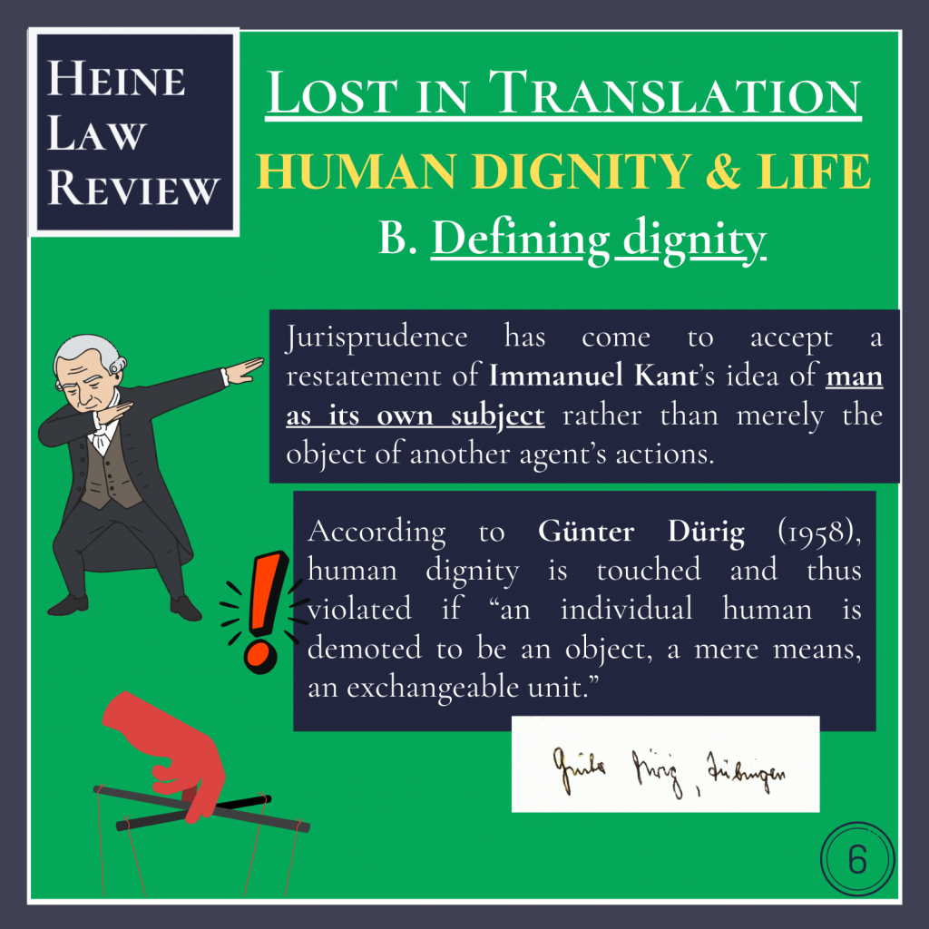 Jurisprudence has come to accept a restatement of Immanuel Kant’s idea of man as its own subject rather than merely the object of another agent’s actions. According to Günter Dürig (1958), human dignity is touched and thus violated if “an individual human is demoted to be an object, a mere means, an exchangeable unit.”