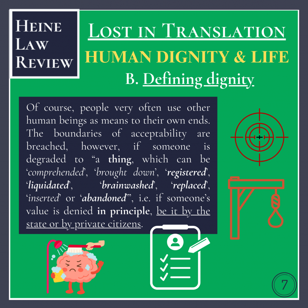 Of course, people very often use other human beings as means to their own ends. The boundaries of acceptability are breached, however, if someone is degraded to “a thing, which can be ‘comprehended’, ‘brought down’, ‘registered’, ‘liquidated’, ‘brainwashed’, ‘replaced’, ‘inserted’ or ‘abandoned’”, i.e. if someone’s value is denied in principle, be it by the state or by private citizens.