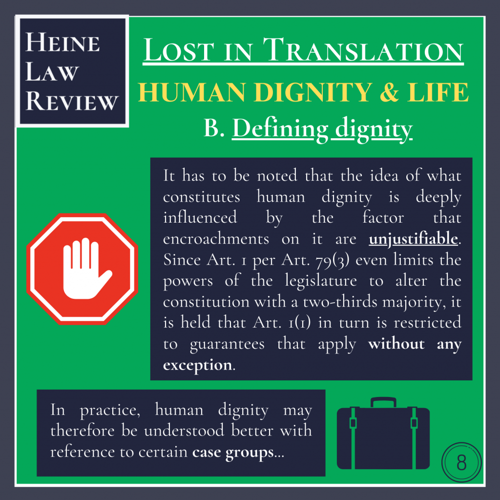 It has to be noted that the idea of what constitutes human dignity is deeply influenced by the factor that encroachments on it are unjustifiable. Since Art. 1 per Art. 79(3) even limits the powers of the legislature to alter the constitution with a two-thirds majority, it is held that Art. 1(1) in turn is restricted to guarantees that apply without any exception.
