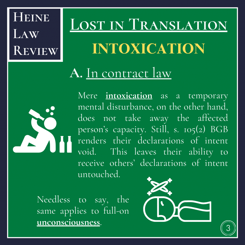 Mere intoxication as a temporary mental disturbance, on the other hand, does not take away the affected person’s capacity. Still, s. 105(2) BGB renders their declarations of intent void. This leaves their ability to receive others’ declarations of intent untouched.