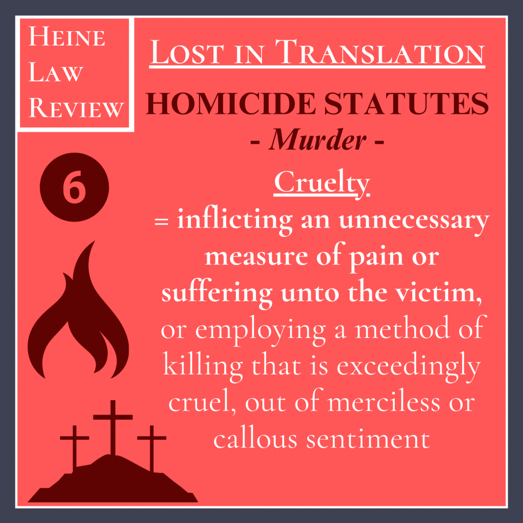 Cruelty (Grausamkeit) is present if the perpetrator inflicts an unnecessary measure of pain or suffering unto the victim (or employs a killing method that is exceedingly cruel, such as burning or crucifixion), out of a merciless or callous sentiment.