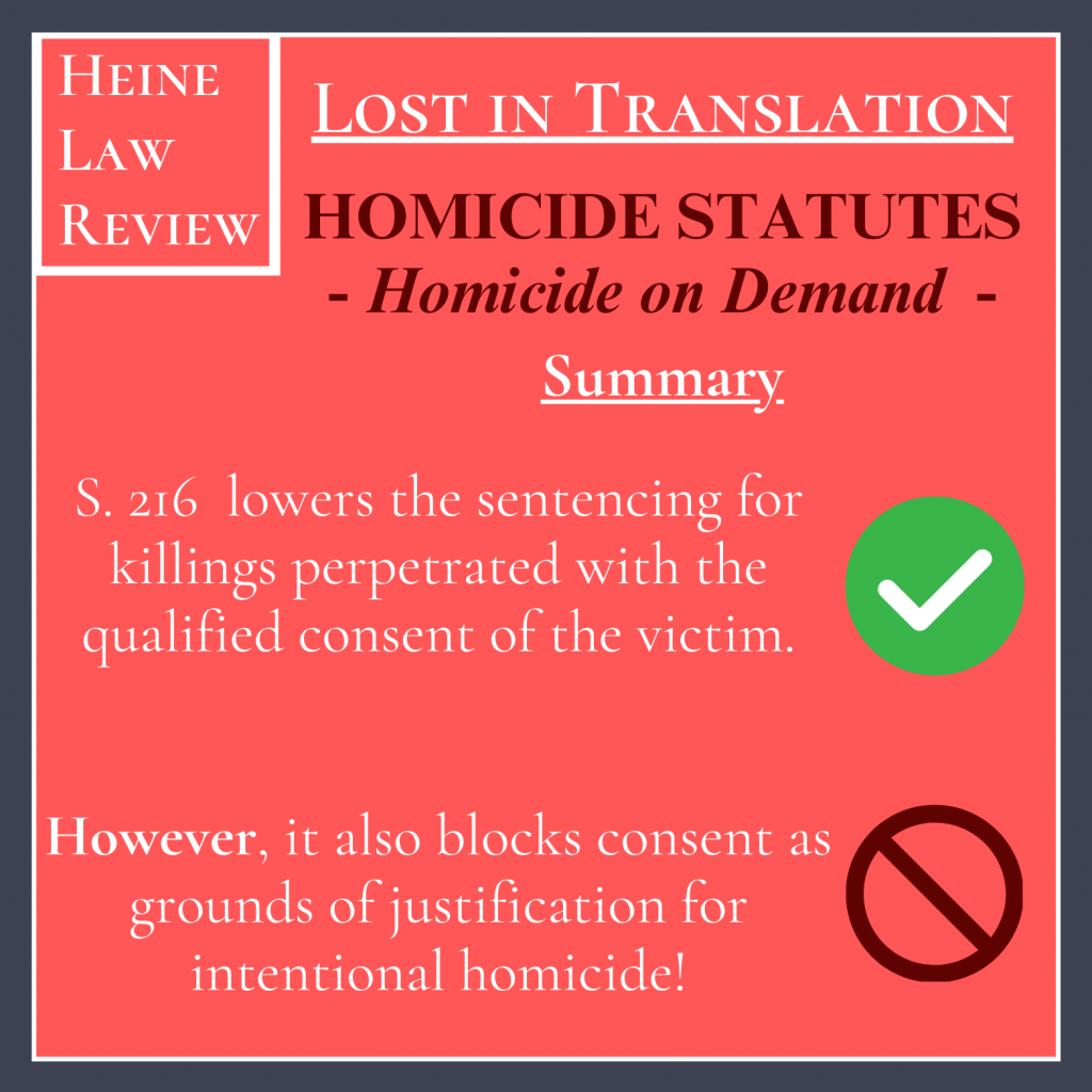 S. 216 also implicitly clarifies that mere consent, unlike e.g. self-defence or necessity, is no grounds of justification for intentional homicide!