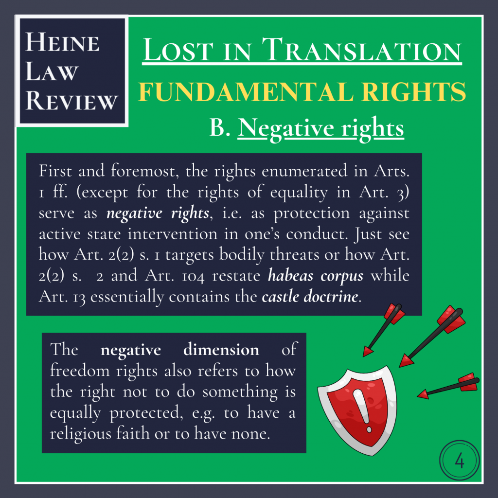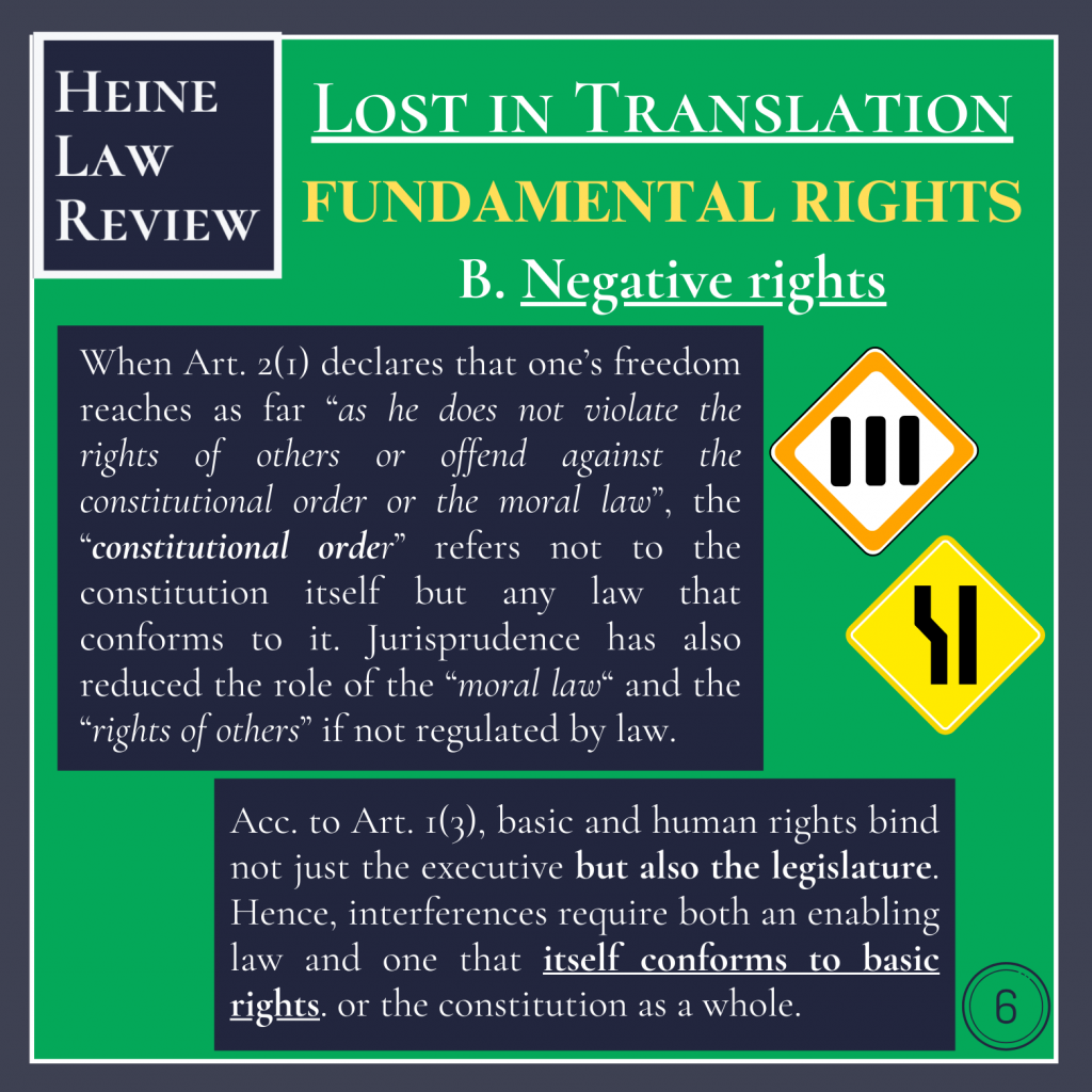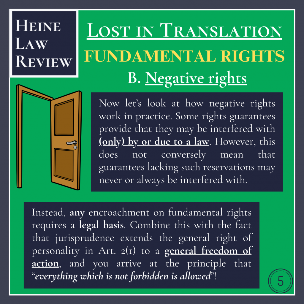 Now let’s look at how negative rights work in practice. Some rights guarantees provide that they may be interfered with (only) by or due to a law. However, this does not conversely mean that guarantees lacking such reservations may never or always be interfered with. Instead, any encroachment on fundamental rights requires a legal basis. Combine this with the fact that jurisprudence extends the general right of personality in Art. 2(1) to a general freedom of action, and you arrive at the principle that “everything which is not forbidden is allowed”!