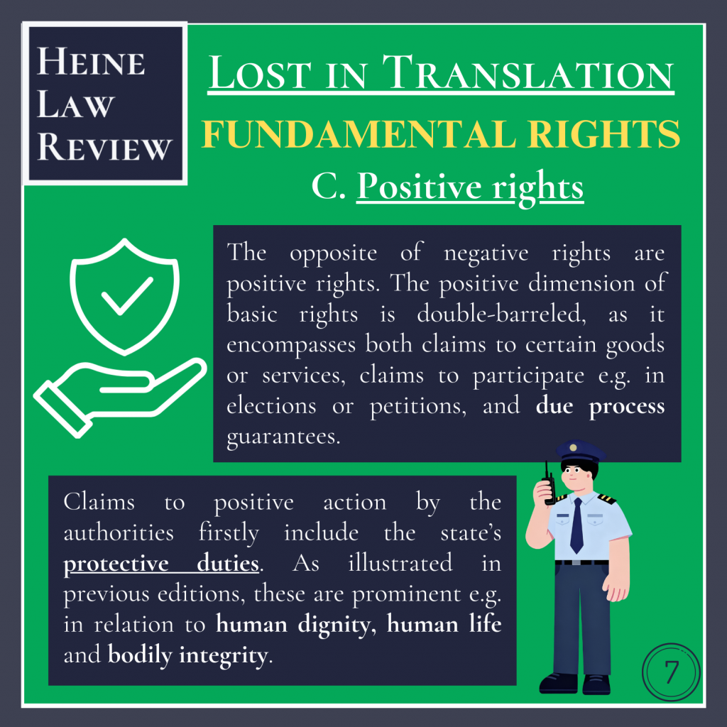The opposite of negative rights are positive rights. The positive dimension of basic rights is double-barreled, as it encompasses both claims to certain goods or services, claims to participate e.g. in elections or petitions, and due process guarantees.