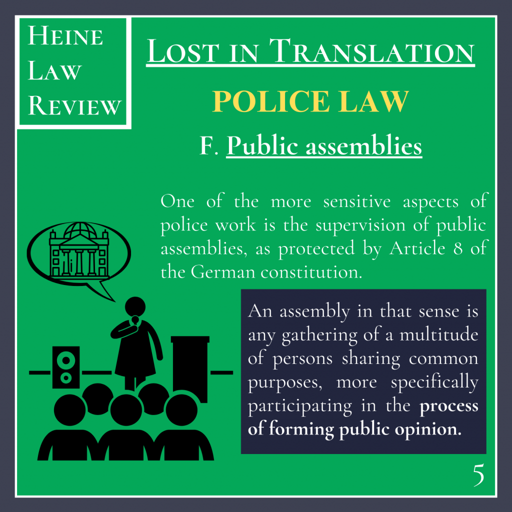 One of the more sensitive aspects of police work is the supervision of public assemblies, as protected by Article 8 of the German constitution. An assembly in that sense is any gathering of a multitude of persons sharing common purposes, more specifically participating in the process of forming public opinion.