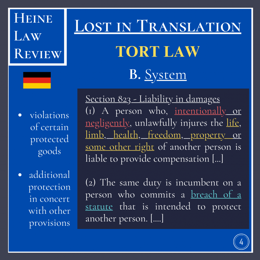 Example: A battered claimant will be entitled to damages according to section 823(1), but also section 823(2) BGB in conjunction with s. 223 of the Criminal Code or StGB. Negligently injuring someone bears the same consequence, under s. 823(1) BGB as well as s. 823(2) BGB + s. 229 StGB.