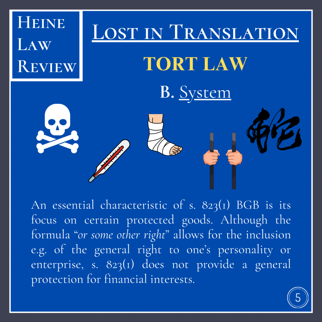 An essential characteristic of s. 823(1) BGB is its focus on certain protected goods. Although the formula “or some other right” allows for the inclusion e.g. of the general right to one’s personality or enterprise, s. 823(1) does not provide a general protection for financial interests.