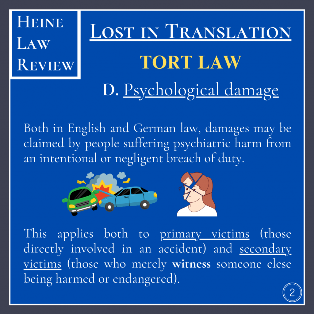 Both in English and German law, damages may be claimed by people suffering psychiatric harm from an intentional or negligent breach of duty. This applies both to primary victims (those directly involved in an accident) and secondary victims (those who merely witness someone else being harmed or endangered).