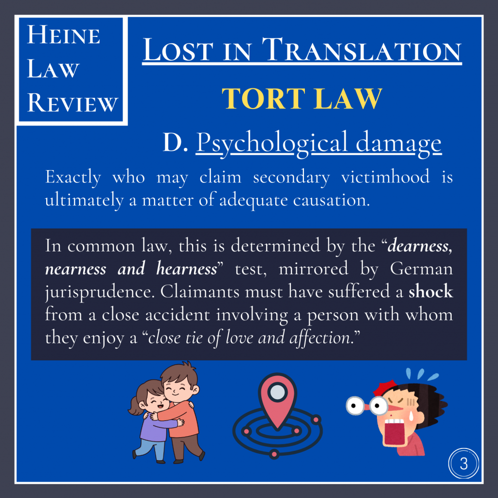 Exactly who may claim secondary victimhood is ultimately a matter of adequate causation. In common law, this is determined by the “dearness, nearness and hearness” test, mirrored by German jurisprudence. Claimants must have suffered a shock from a close accident involving a person with whom they enjoy a “close tie of love and affection.”