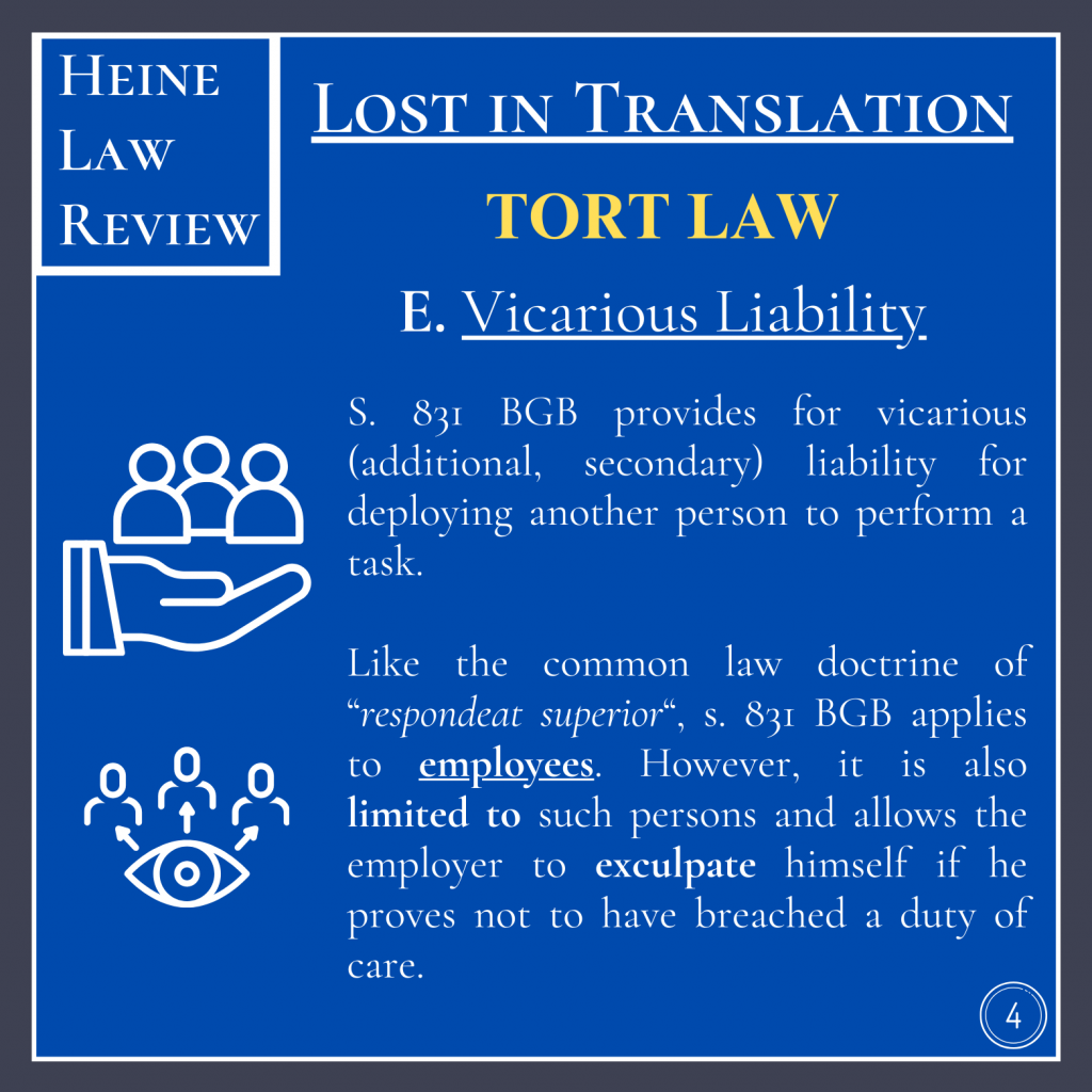 S. 831 BGB provides for vicarious (additional, secondary) liability for deploying another person to perform a task. Like the common law doctrine of “respondeat superior“, s. 831 BGB applies to employees. However, it is also limited to such persons and allows the employer to exculpate himself if he proves not to have breached a duty of care.
