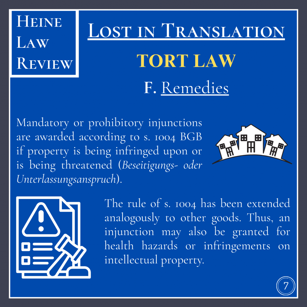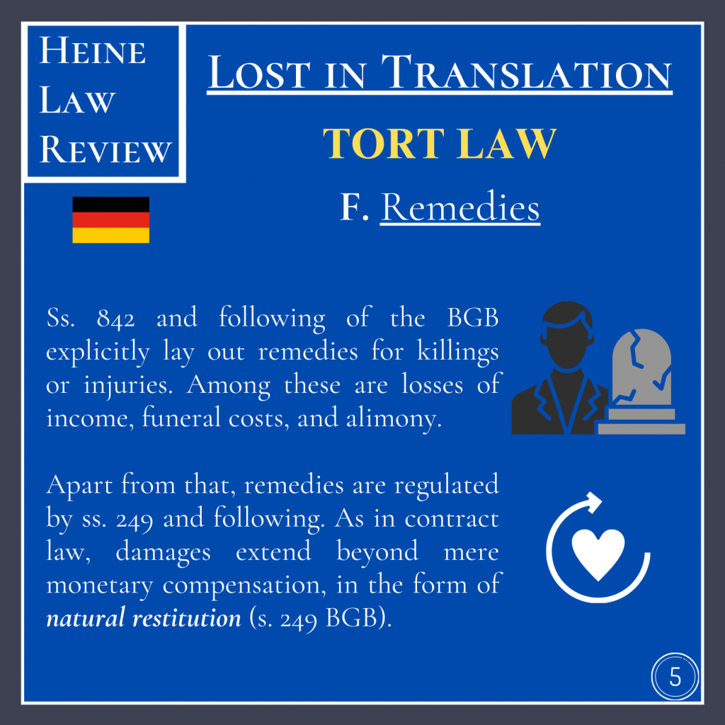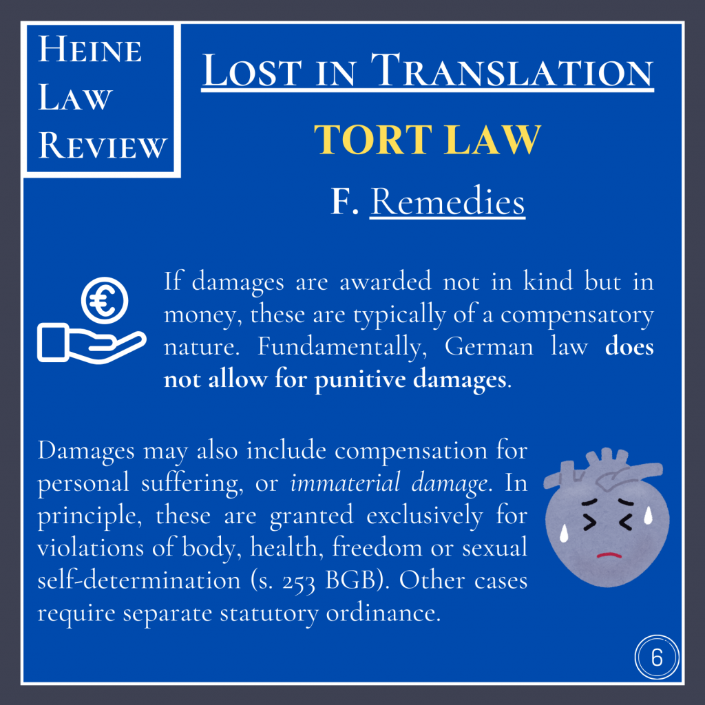 Apart from that, remedies are regulated by ss. 249 and following. As in contract law, damages extend beyond mere monetary compensation, in the form of natural restitution (s. 249 BGB). If damages are awarded not in kind but in money, these are typically of a compensatory nature. Fundamentally, German law does not allow for punitive damages.